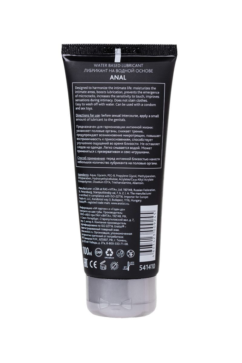 Анальный лубрикант на водной основе. Предназначен для гармонизации интимной жизни: увлажняет половые органы, снижает трение, предупреждает возникновение микротрещин. Повышает восприимчивость к прикосновениям, способствует улучшению ощущений во время близости. Не оставляет следов на одежде, легко смывается водой. Может применяться с презервативами и секс-игрушками.
