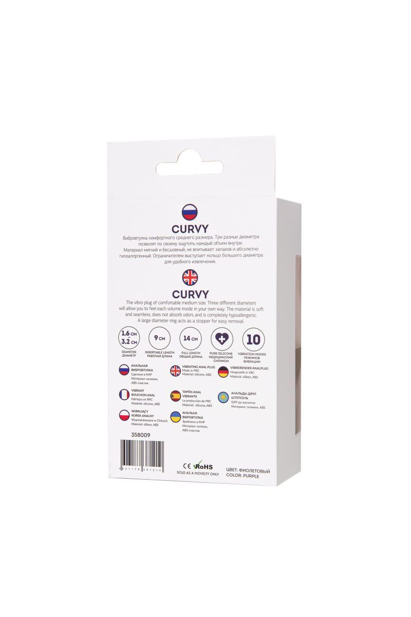 Curvy - вибровтулка комфортного среднего размера. Три разных диаметра позволит по своему ощутить каждый объем внутри. Материал мягкий и бесшовный, не впитывает запахов и абсолютно гипоаллергенный. Ограничителем выступает кольцо большого диаметра для удобного извлечения. 10 режимов вибрации, съёмная вибропуля. Рабочая длина - 9 см. Минимальный диаметр - 1,6 см.