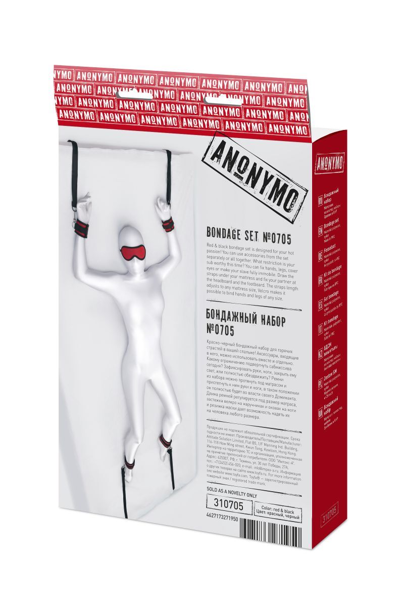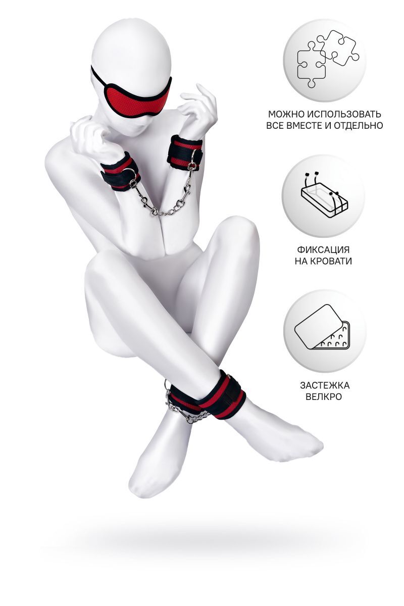 Наручники, оковы и маска - классический набор предметов для игры в подчинение, обязательный для начинающих и опытных поклонников БДСМ. Красно-черный бондажный набор для горячих страстей в вашей спальне! Аксессуары, входящие в него, можно использовать вместе и отдельно. Какому ограничению подвергнуть сабмиссива сегодня? Зафиксировать руки, ноги, закрыть ему свет, или полностью обездвижить? Маска, наручники, оковы и ремни для фиксации - все это незаменимые аксессуары для остроты ощущений. Ограничение свободы движения руками и ногами и полная темнота обостряют другие чувства до предела. Ремни из набора можно протянуть под матрасом и пристегнуть к ним руки и ноги, в таком положении сабмиссив полностью будет во власти своего Доминанта. Длина ремней регулируется под размер матраса, наручники и оковы имеют застежку велкро, маска крепится на резинке – все это дает возможность надеть предметы на человека любого размера. Длина наручников - 23,5 см., ширина - 6 см. Длина оков - 28 см., ширина - 6 см. Длина маски - 25 см., ширина - 7 см. Общая длина ремней - 470 см. Ширина ремней - 2,5 см.