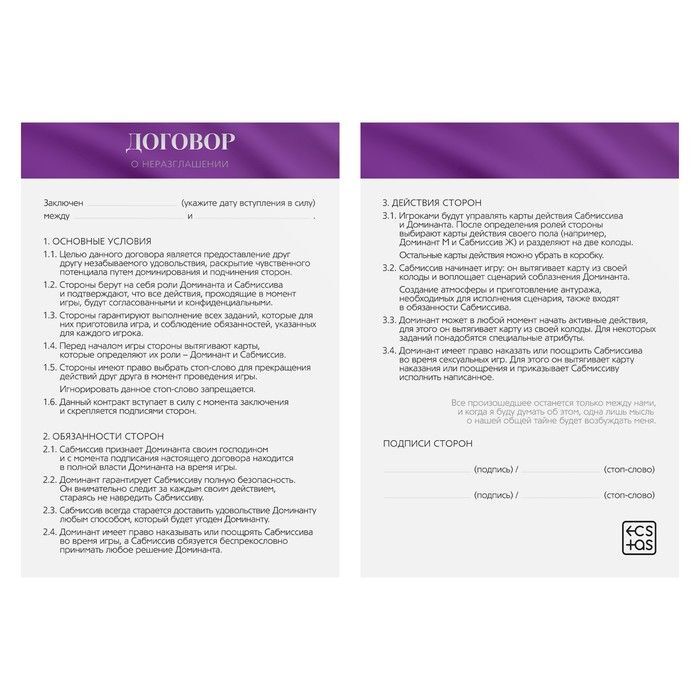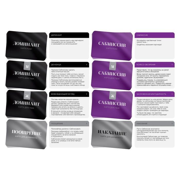 Воплотите в жизнь самые смелые фантазии! «50 оттенков страсти» — это серия эротических игр для двоих, в них используются БДСМ-практики и соответствующие аксессуары. Благодаря этим играм можно испытать уникальные ощущения и узнать о новых источниках удовольствия! Закройте глаза, представьте, как лёгкое перо едва касается вашего тела, а тугая лента резко связывает руки… Попробуйте все сценарии, что предложит игра. Волнующие аксессуары из набора помогут достичь пика удовольствия! Вы готовы установить особые правила игры? Подпишите договор о неразглашении и выберите желаемую роль. Один из вас будет доминирующим (доминантом), а другой — подчиняющимся (сабмиссивом). Доминирующий вступит в права владения телом и желаниями партнёра, а подчиняющемуся предстоит покорно следовать указаниям и… сдерживать крики удовольствия. Подчиняющийся начинает игру: он вытягивает карту из своей колоды и воплощает сценарий соблазнения доминирующего. Доминирующий может в любой момент наказать или поощрить подчиняющегося во время сексуальных игр. Для этого доминирующий вытягивает карту наказания или поощрения и приказывает подчиняющемуся исполнить написанное. Внутри вы найдёте: 15 карт сценариев, 15 карт предметов, перо, маску, ленту, плётку, договор о неразглашении.
