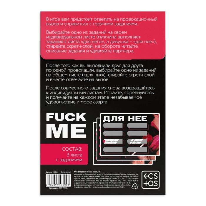 Дарите наслаждение и истинное удовольствиеПеред вами горячие задания, которые подарят каждому страсть и море азарта! С ними вы удивите партнера и откроете друг другу новые грани чувств.Как пользоваться?Выбирайте одно из заданий: «для него» и «для нее», стирайте скретч-слой и выполняйте написанные провокации. Соревнуйтесь и бросайте вызов!Состав: 3 листа с заданиями
