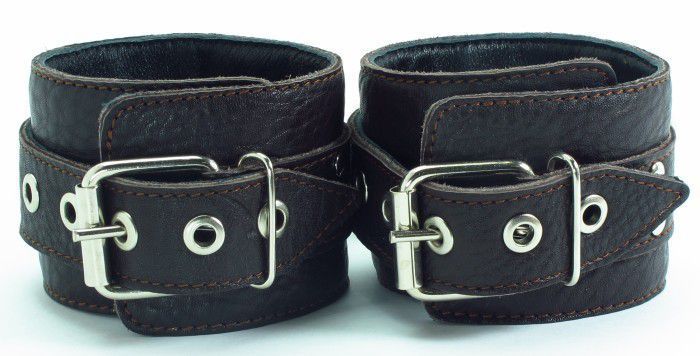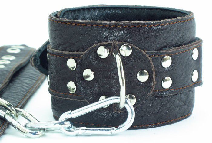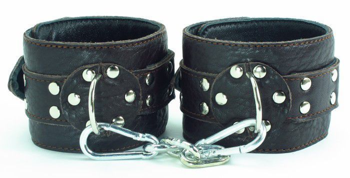 Кожаные наручники потрясающего коричневого цвета.Ширина - 6 см. Украшены заклепками и соединяются между собой цепью с карабинами (длина цепочки - 13 см) Размер наручников регулируется при помощи застежки.