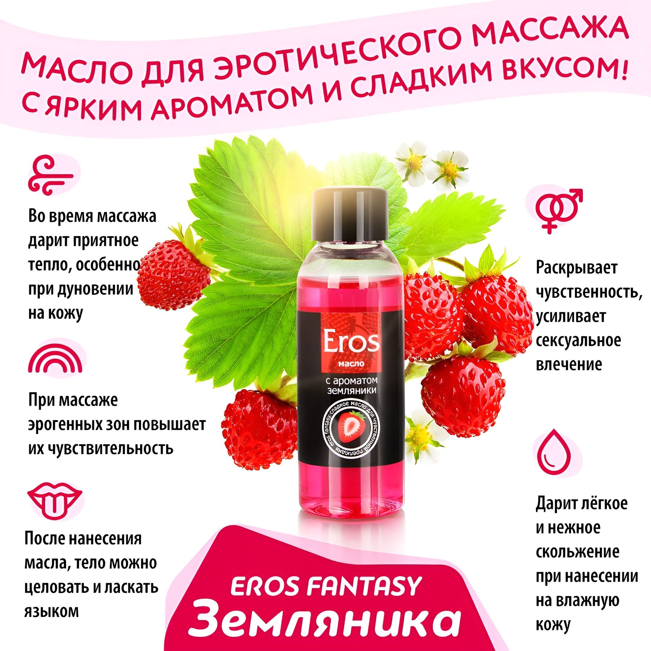 Масло массажное «Eros Fantasy» для эротического массажа. Вызывает ощущение тепла, особенно при дуновении. Повышает чувствительность. Имеет приятный аромат земляники и сладкий вкус. Обеспечивает длительное скольжение. Легко смывается водой.