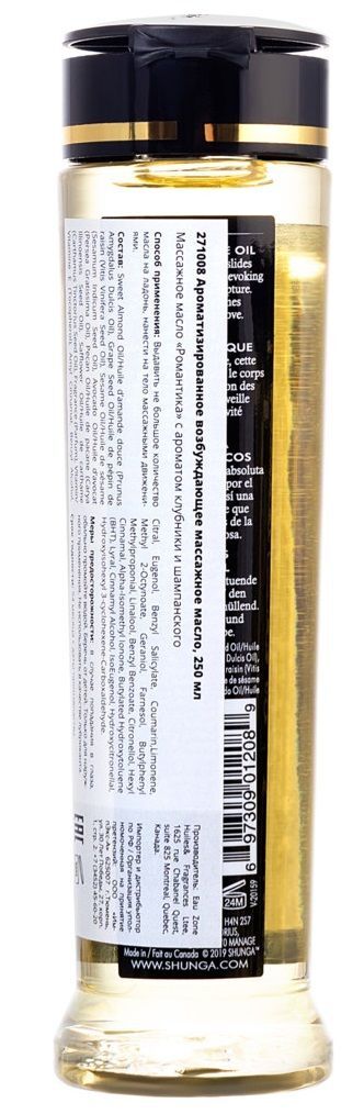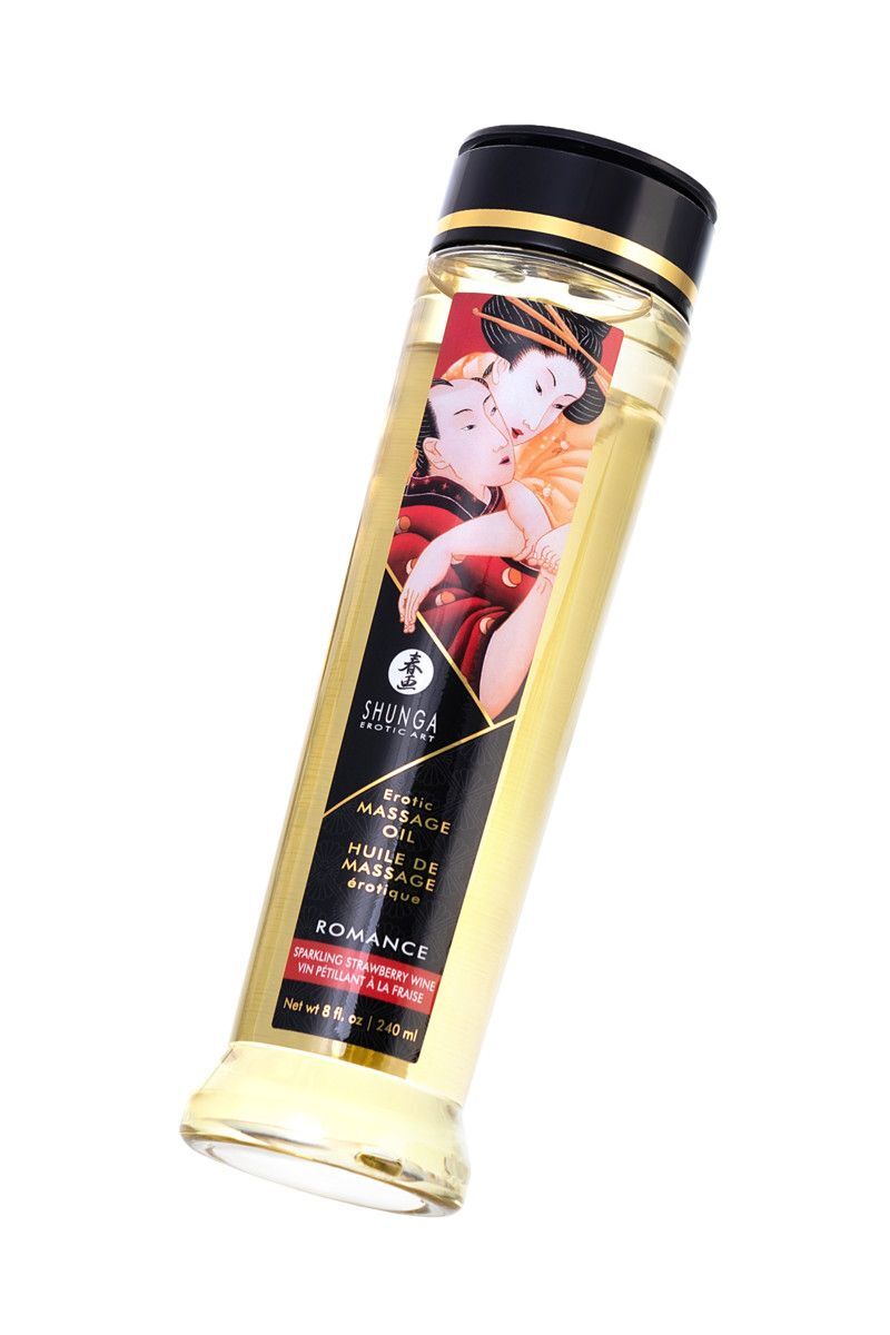 Массажное масло с ароматом клубники и шампанского Romance. 100% натуральные масла холодного отжима, с витамином Е (антиоксидант), без жирных остатков, не забивает поры, нет минерального или животного масла. Мягкость и шелковистость этого масла с приятным скользящим эффектом на коже вызывает ощущение полного восторга. Сексуальное желание нарастает и вы готовы к любви. Получите взаимное удовольствие от чувственного эротического массажа с использованием нашей эксклюзивной смеси масел холодного отжима, тщательно отобранных за свои стимулирующие и придающие энергию свойства. Масло легко скользит по коже, не оставляя жирных ощущений, в то время как различные экзотические ароматы поднимут ваши чувства до вершин возбуждения. Идеально подходит для того, чтобы насладиться расслабляющим массажем или сделать его, совместив с обволакивающими обольстительными ласками. Это на 100 % натуральное масло с упоительным ароматом, легко скользит по коже, не оставляя жирной пленки. Запах массажному маслу придают эфирные масла и отдушки, что в отличие от большей части другой продукции SHUNGA, ароматизированной вкусовыми добавками, делает его несъедобным.
