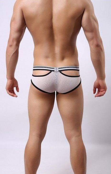 Белые мужские трусы-брифы с вырезами и леопардовым рисунком.