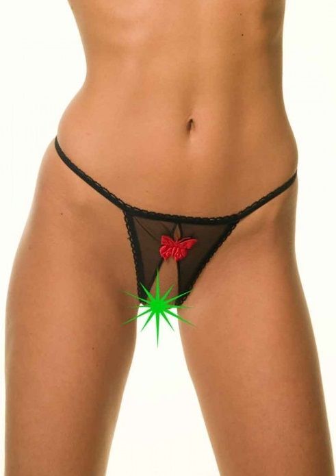 Женские трусы-стринги с вырезами. Трусы сшиты из полупрозрачной ткани, на тоненьких резиночках. Спереди аккуратная бабочка.