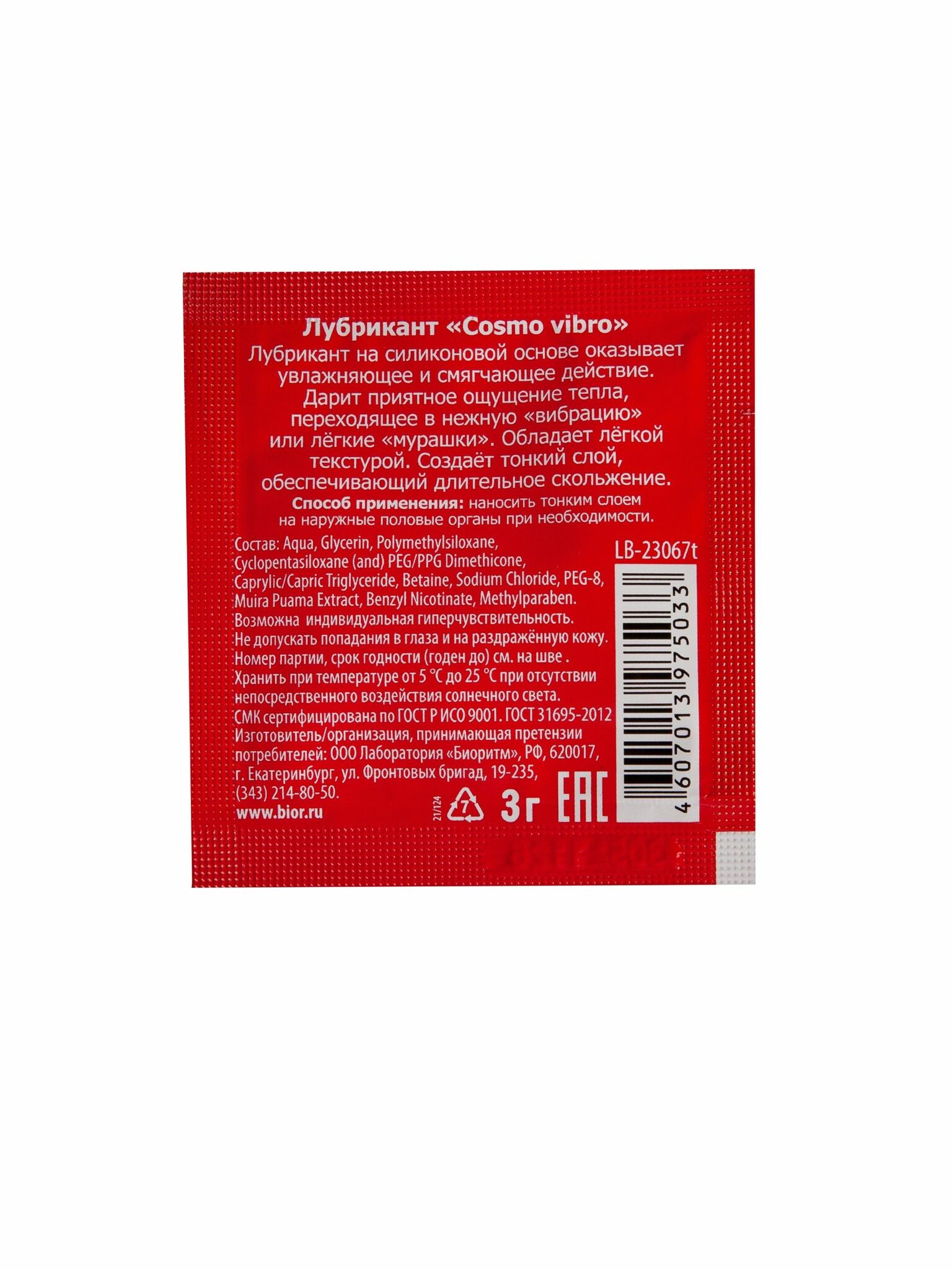 Ключ к яркому сексу - стимулирующий лубрикант нового поколения на силиконовой основе Cosmo vibro. Это больше, чем просто лубрикант! Активный компонент в составе - экстракт муира-пуамы - оказывает необычное стимулирующее действие, вызывая нежную «вибрацию» и возбуждающие «мурашки». Обладает легкой текстурой, дарит необычные сладостные ощущения обоим партнерам и обеспечивает длительное скольжение. Оказывает увлажняющее и смягчающее действие. Совместим с изделиями из латекса и полимерных материалов.