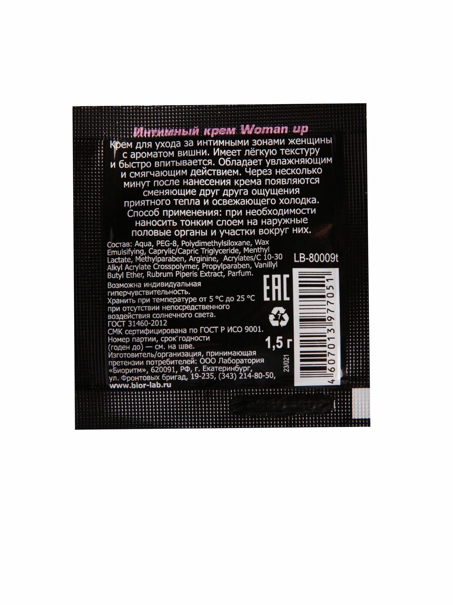 Женский возбуждающий крем Woman up с волнующим ароматом вишни. Раскрывает чувственность и раскрепощает, дарит потрясающие ощущения во время интимной близости. Через несколько минут после нанесения Woman up появляются волнообразные ощущения – приятное тепло и освежающий холодок. Крем обладает нежной текстурой, увлажняет, смягчает и ароматизирует интимные зоны.
